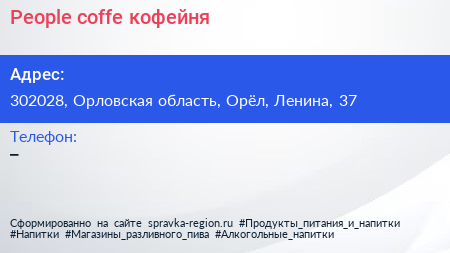 People coffe, кофейня по адресу 302028, Орловская область, Орёл, Ленина, 37 в дальнейшем Организация, размещена в следующих категориях: