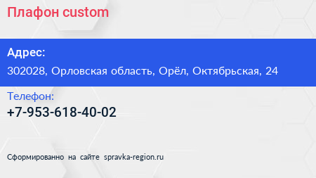 Плафон custom по адресу 302028, Орловская область, Орёл, Октябрьская, 24 в дальнейшем Организация, размещена в следующих категориях: