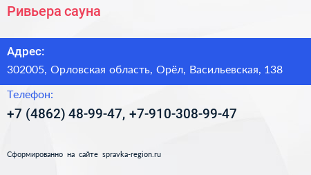 Ривьера, сауна по адресу 302005, Орловская область, Орёл, Васильевская, 138 в дальнейшем Организация, размещена в следующих категориях: