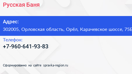 Русская Баня по адресу 302005, Орловская область, Орёл, Карачевское шоссе, 75Б в дальнейшем Организация, размещена в следующих категориях: