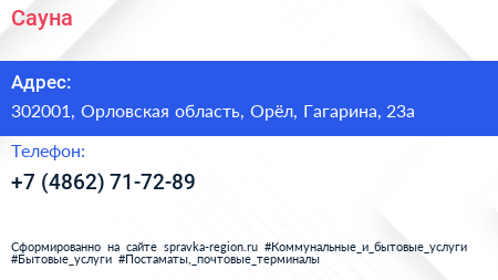 Сауна по адресу 302001, Орловская область, Орёл, Гагарина, 23а в дальнейшем Организация, размещена в следующих категориях: