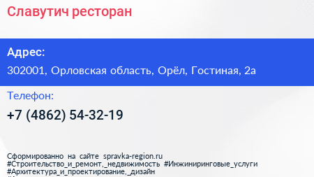 Славутич, ресторан по адресу 302001, Орловская область, Орёл, Гостиная, 2а в дальнейшем Организация, размещена в следующих категориях: