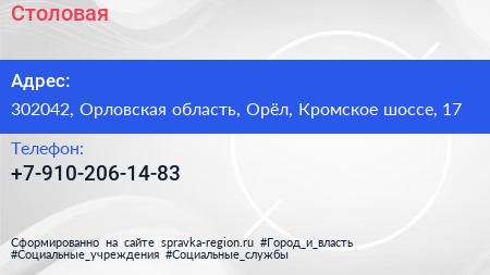 Столовая по адресу 302042, Орловская область, Орёл, Кромское шоссе, 17 в дальнейшем Организация, размещена в следующих категориях: