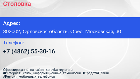 Столовка по адресу 302002, Орловская область, Орёл, Московская, 30 в дальнейшем Организация, размещена в следующих категориях: