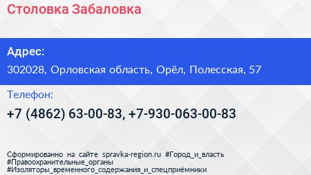 Столовка-Забаловка по адресу 302028, Орловская область, Орёл, Полесская, 57 в дальнейшем Организация, размещена в следующих категориях: