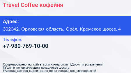 Travel Coffee, кофейня по адресу 302042, Орловская область, Орёл, Кромское шоссе, 4 в дальнейшем Организация, размещена в следующих категориях: