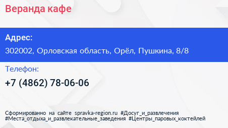 Веранда, кафе по адресу 302002, Орловская область, Орёл, Пушкина, 8/8 в дальнейшем Организация, размещена в следующих категориях: