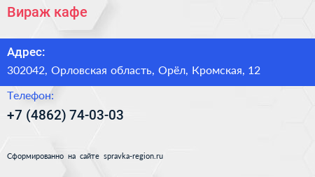 Вираж, кафе по адресу 302042, Орловская область, Орёл, Кромская, 12 в дальнейшем Организация, размещена в следующих категориях: