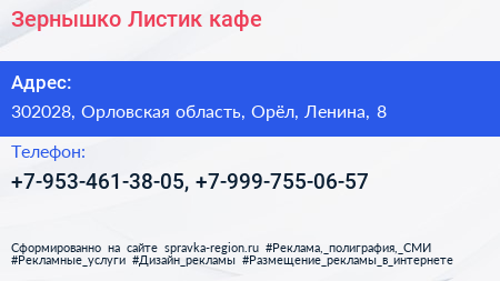 Зернышко & Листик, кафе по адресу 302028, Орловская область, Орёл, Ленина, 8 в дальнейшем Организация, размещена в следующих категориях:
