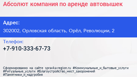 Абсолют, компания по аренде автовышек по адресу 302002, Орловская область, Орёл, Революции, 2 в дальнейшем Организация, размещена в следующих категориях: