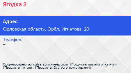 Ягодка 3 по адресу Орловская область, Орёл, Игнатова, 20 в дальнейшем Организация, размещена в следующих категориях: