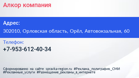 Алкор, компания по адресу 302010, Орловская область, Орёл, Автовокзальная, 60 в дальнейшем Организация, размещена в следующих категориях:
