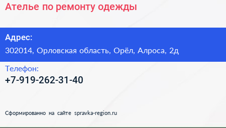 Ателье по ремонту одежды по адресу 302014, Орловская область, Орёл, Алроса, 2д в дальнейшем Организация, размещена в следующих категориях: