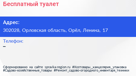Бесплатный туалет по адресу 302028, Орловская область, Орёл, Ленина, 17 в дальнейшем Организация, размещена в следующих категориях: