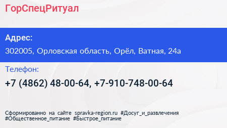 ГорСпецРитуал по адресу 302005, Орловская область, Орёл, Ватная, 24а в дальнейшем Организация, размещена в следующих категориях: