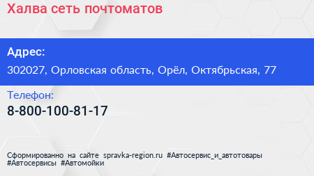 Халва, сеть почтоматов по адресу 302027, Орловская область, Орёл, Октябрьская, 77 в дальнейшем Организация, размещена в следующих категориях: