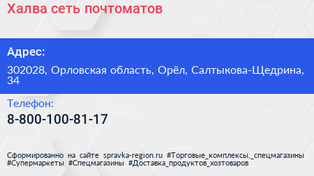 Халва, сеть почтоматов по адресу 302028, Орловская область, Орёл, Салтыкова-Щедрина, 34 в дальнейшем Организация, размещена в следующих категориях: