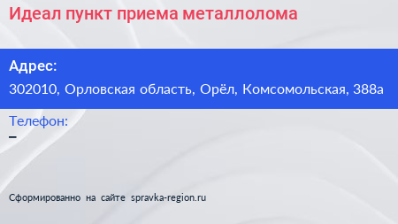 Идеал, пункт приема металлолома по адресу 302010, Орловская область, Орёл, Комсомольская, 388а в дальнейшем Организация, размещена в следующих категориях: