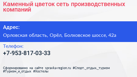 Каменный цветок, сеть производственных компаний по адресу Орловская область, Орёл, Болховское шоссе, 42а в дальнейшем Организация, размещена в следующих категориях: