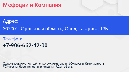 Мефодий и Компания по адресу 302001, Орловская область, Орёл, Гагарина, 13Б в дальнейшем Организация, размещена в следующих категориях:
