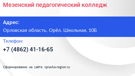 Мезенский педагогический колледж по адресу Орловская область, Орёл, Школьная, 10Б в дальнейшем Организация, размещена в следующих категориях: