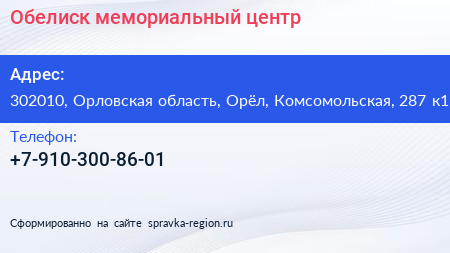 Обелиск, мемориальный центр по адресу 302010, Орловская область, Орёл, Комсомольская, 287 к1 в дальнейшем Организация, размещена в следующих категориях: