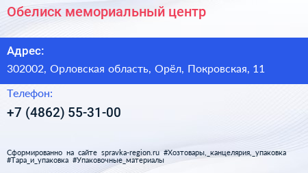 Обелиск, мемориальный центр по адресу 302002, Орловская область, Орёл, Покровская, 11 в дальнейшем Организация, размещена в следующих категориях: