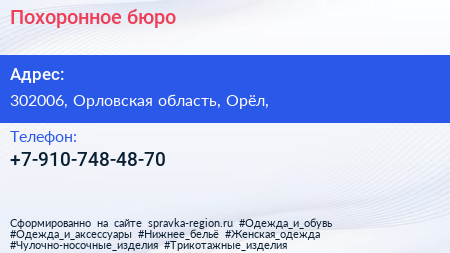Похоронное бюро по адресу 302006, Орловская область, Орёл, в дальнейшем Организация, размещена в следующих категориях: