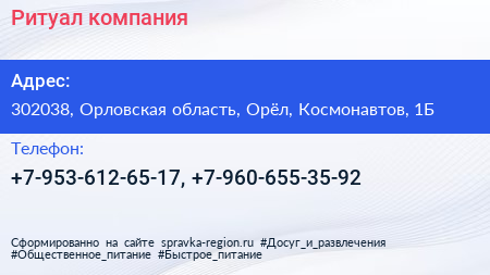 Ритуал, компания по адресу 302038, Орловская область, Орёл, Космонавтов, 1Б в дальнейшем Организация, размещена в следующих категориях: