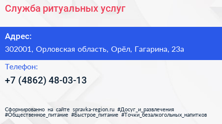 Служба ритуальных услуг по адресу 302001, Орловская область, Орёл, Гагарина, 23а в дальнейшем Организация, размещена в следующих категориях: