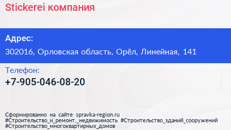 Stickerei, компания по адресу 302016, Орловская область, Орёл, Линейная, 141 в дальнейшем Организация, размещена в следующих категориях: