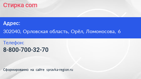 Стирка.com по адресу 302040, Орловская область, Орёл, Ломоносова, 6 в дальнейшем Организация, размещена в следующих категориях:
