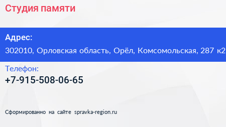 Студия памяти по адресу 302010, Орловская область, Орёл, Комсомольская, 287 к2 в дальнейшем Организация, размещена в следующих категориях:
