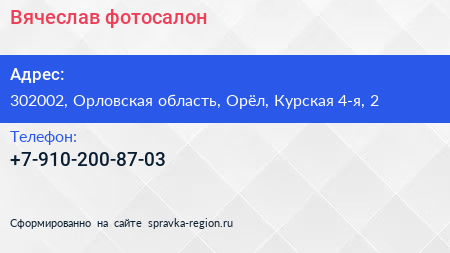 Вячеслав, фотосалон по адресу 302002, Орловская область, Орёл, Курская 4-я, 2 в дальнейшем Организация, размещена в следующих категориях: