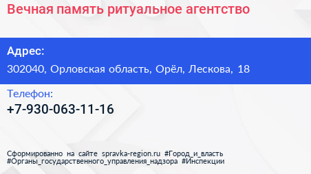 Вечная память, ритуальное агентство по адресу 302040, Орловская область, Орёл, Лескова, 18 в дальнейшем Организация, размещена в следующих категориях: