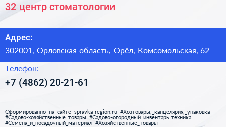 32, центр стоматологии по адресу 302001, Орловская область, Орёл, Комсомольская, 62 в дальнейшем Организация, размещена в следующих категориях: