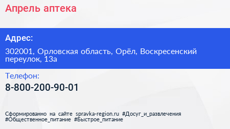 Апрель, аптека по адресу 302001, Орловская область, Орёл, Воскресенский переулок, 13а в дальнейшем Организация, размещена в следующих категориях: