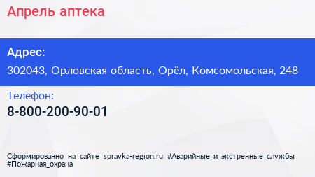 Апрель, аптека по адресу 302043, Орловская область, Орёл, Комсомольская, 248 в дальнейшем Организация, размещена в следующих категориях: