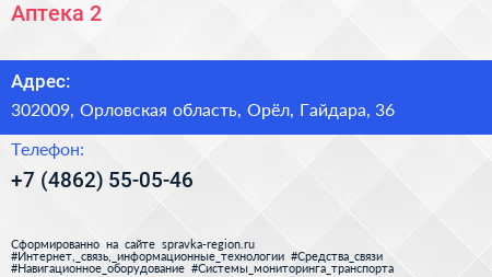 Аптека №2 по адресу 302009, Орловская область, Орёл, Гайдара, 36 в дальнейшем Организация, размещена в следующих категориях: