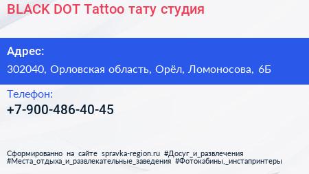 BLACK DOT Tattoo, тату-студия по адресу 302040, Орловская область, Орёл, Ломоносова, 6Б в дальнейшем Организация, размещена в следующих категориях: