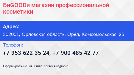БиGOODи, магазин профессиональной косметики по адресу 302001, Орловская область, Орёл, Комсомольская, 25 в дальнейшем Организация, размещена в следующих категориях: