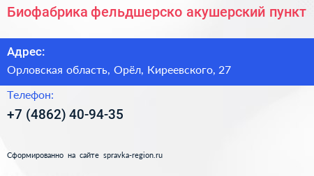 Биофабрика, фельдшерско-акушерский пункт по адресу Орловская область, Орёл, Киреевского, 27 в дальнейшем Организация, размещена в следующих категориях: