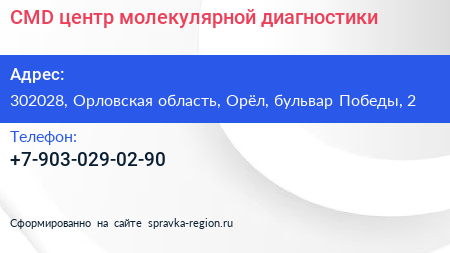 CMD, центр молекулярной диагностики по адресу 302028, Орловская область, Орёл, бульвар Победы, 2 в дальнейшем Организация, размещена в следующих категориях:
