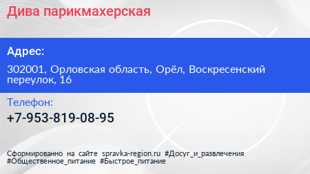 Дива, парикмахерская по адресу 302001, Орловская область, Орёл, Воскресенский переулок, 16 в дальнейшем Организация, размещена в следующих категориях:
