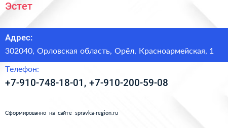 Эстет по адресу 302040, Орловская область, Орёл, Красноармейская, 1 в дальнейшем Организация, размещена в следующих категориях: