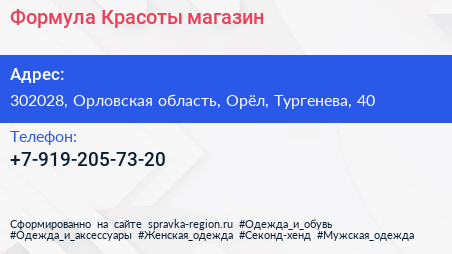 Формула Красоты, магазин по адресу 302028, Орловская область, Орёл, Тургенева, 40 в дальнейшем Организация, размещена в следующих категориях: