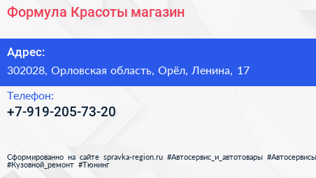 Формула Красоты, магазин по адресу 302028, Орловская область, Орёл, Ленина, 17 в дальнейшем Организация, размещена в следующих категориях: