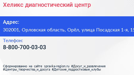 Хеликс, диагностический центр по адресу 302001, Орловская область, Орёл, улица Посадская 1-я, 15 в дальнейшем Организация, размещена в следующих категориях: