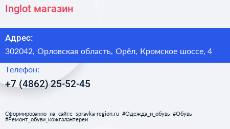 Inglot, магазин по адресу 302042, Орловская область, Орёл, Кромское шоссе, 4 в дальнейшем Организация, размещена в следующих категориях: