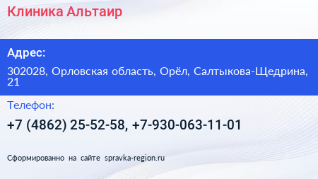 Клиника Альтаир по адресу 302028, Орловская область, Орёл, Салтыкова-Щедрина, 21 в дальнейшем Организация, размещена в следующих категориях: